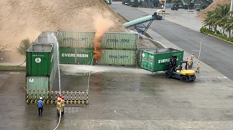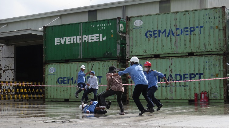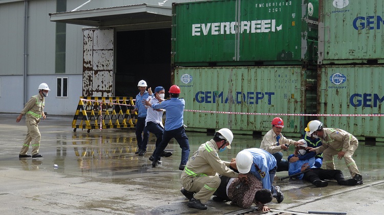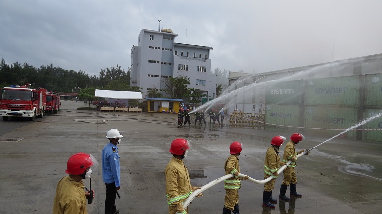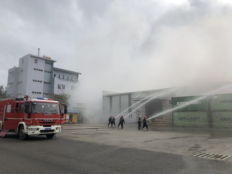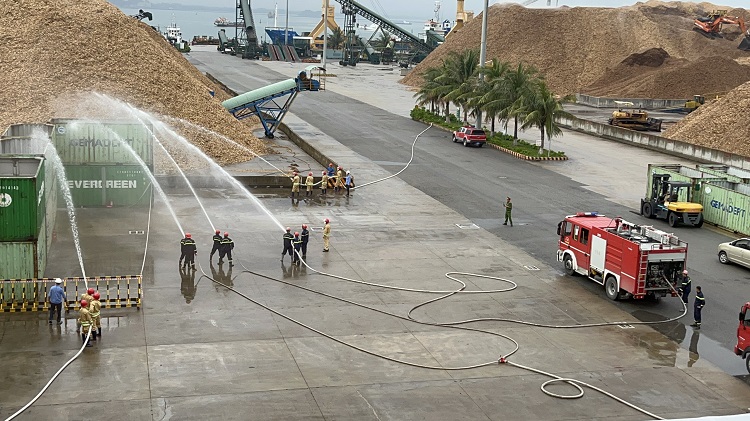 Năm nay, tình huống giả định: Tại kho hàng xảy ra sự cố chập điện gây cháy nổ lớn và khói bốc lên ngùn ngụt. Công nhân lập tức truy hô cháy và báo cáo ngay cho đồng chí Điều hành sản xuất. Đồng chí đã chỉ đạo ngay đội PCCC cơ sở triển khai các lực lượng chữa cháy, ứng phó sự cố.Tuy nhiên, ngọn lửa ngày một lan rộng, với lực lượng chữa cháy của Cảng không thể khống chế được. Đội trưởng đội PCCC của Cảng đã gọi cho lực lượng chữa cháy chuyên nghiệp của công an Tỉnh qua số 114 để tăng cường công tác hỗ trợ chữa cháy. Dưới sự phối hợp chữa cháy của lực lượng chữa cháy tại chỗ và Phòng Cảnh sát PCCC & CNCH, đám cháy đã được khống chế.